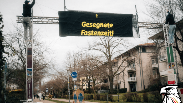 Mit einer spektakulären Aktion hat die europäisch-patriotisch ausgerichtete „Identitäre Bewegung“ (IB) in Freiburg ein Zeichen gegen die Islamisierung gesetzt. IB-Aktivisten verhüllten die Ramadan-Beleuchtung in der baden-württembergischen Stadt, die als eines der Tore zum Schwarzwald gilt. Sie brachten ein Banner an, auf dem „Gesegnete Fastenzeit“ stand. Darüber war ein christliches Kreuz zu sehen.
