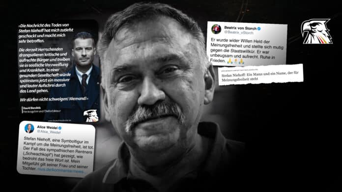Der plötzliche und unerwartete Tod von Rentner Stefan Niehoff hat in der AfD Bestürzung ausgelöst, aber auch darüber hinaus ein breites Echo gefunden. Der treu sorgende Familienvater aus Franken wurde zum Vorbild für viele Deutsche, die nach ihm ebenfalls den Mut fassten, sich gegen den Einschüchterungsparagrafen 188 des Strafgesetzbuches (StGB) aufzulehnen.