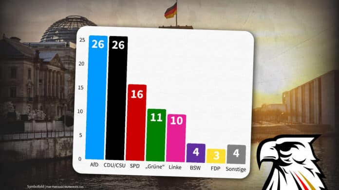 Stärkste Einzelpartei bleibt ganz klar die AfD, da umgerechnet etwa sechs Prozent der bundesweiten Zustimmungswerte zur Union auf die CSU entfallen.