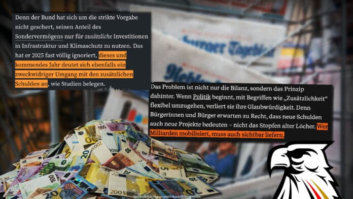 Die „Augsburger Allgemeine“ kritisiert, dass die Ausgaben zu wenig Resultate hervorgebracht haben: „Die Bürgerinnen und Bürger erwarten zu Recht, dass neue Schulden auch neue Projekte bedeuten. Wer Milliarden mobilisiert, muss auch sichtbar liefern. Das Sondervermögen wurde nicht zuletzt geschaffen, um Vertrauen zu signalisieren: in die Handlungsfähigkeit des Staates, in den ernsthaften Willen zur Modernisierung. Am Ende zählt nicht, wie geschickt Mittel verbucht werden, sondern ob Brücken saniert und Netze ausgebaut werden. Alles andere ist Buchhaltung – keine Politik.“